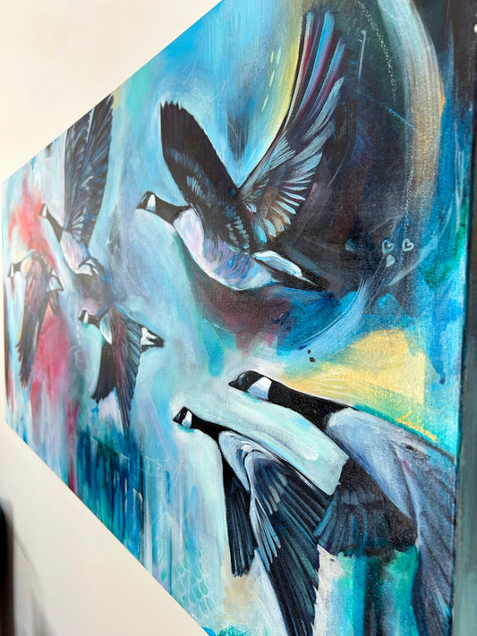 24" x 48" Original Painting of Geese in flight - "Coming Home"