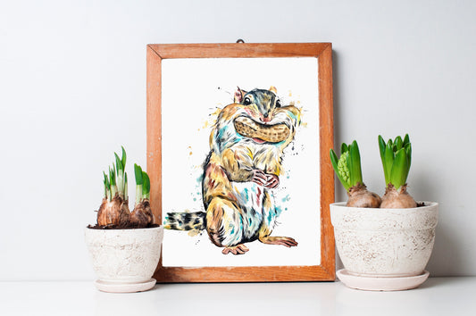 Cute Animal Art - Chipmunk Colorful Watercolor Painting - Tiny Hoarder